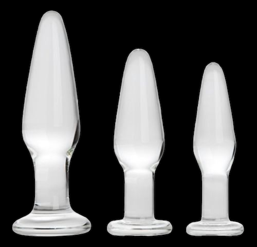 Trio of glass anal plugs is great for training or re-training those special muscles for better control, strength and endurance. It's a pelvic floor workout with many sexual health benefits. Made from durable tempered borosilicate glass, each plug is a different size. The small plug is 4.5 in. by 1.15 in.; medium is 4.75 in. by 1.35 in.; and large is 5.75 in. by 1.55 in. Chill or warm glass for even more stimulation.